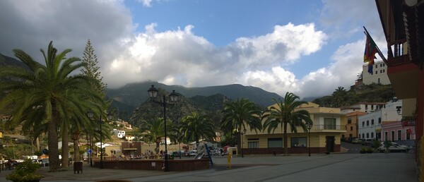 An Igualero mit seiner Kirche und dem Aussichtspunkt an dem wir Sonnenöl auftragen, wir sind ja jetzt im sonnigen Süden der Insel, vorbei joggen wir mit kleinen Unterbrechungen bis Pavon und Chipude , einem kleinen Dorf unterhalb des heiligen Tafelbergs der Ureinwohner. Unterwegs sehen wir einen kleinen Bach, den einzigen an den ich mich erinnern kann auf La Gomera gesehen zu haben und eine Gruppe Engländer mit denen U. kurz anbandelt während er seine Kamera die beim laufen aus der gewohnt Bombensicherer Befestigung gefallen ist wieder aufsammelt. In der Bar zum LKW-Fahrer genehmigen wir uns ein Bier und wieder ein Sandwich. Die Sonne brennt inzwischen vom blauen Himmel. Wir sitzen vor der Bar auf weißen Plastikstühlen die der Wirt auf seinem gekachelten Gehweg aufgestellt hat. Zum ersten mal ist es richtig südlich. Auf einer Tafel wird in Kreide und schlechtem Spanisch mit dem "Classico" geworben. (Fußballspiel zwischen Real Madrid und dem FC Barcelona) Das gibt es hier heute Abend wohl im Fernsehen zu sehen. Die Engländer schließen zu uns auf. Etwa zwanzig Stück sind es, alle geschätzt zwischen fünfzig und siebzig. Kommen wohl aus Südlondon und wandern ein paar Stunden in organisierter Form, im nächsten Dorf werden sie von einem Bus abgeholt werden. Gestärkt wackeln wir ein paar Kilometer entlang der kleinen ineinander übergehenden Dörfer stets links mit Blick auf das Meer entlang der Südküste. Zweiter Espresso, zweites Bier auf einer Bank vor einer Bar in El Cercado . Wir fragen ein paar Deutsche mit Gomera Erfahrung nach dem Inselklima. Ist angeblich in der Mitte und im Norden, Osten und Westen der Insel immer bewölkt und regnerisch.